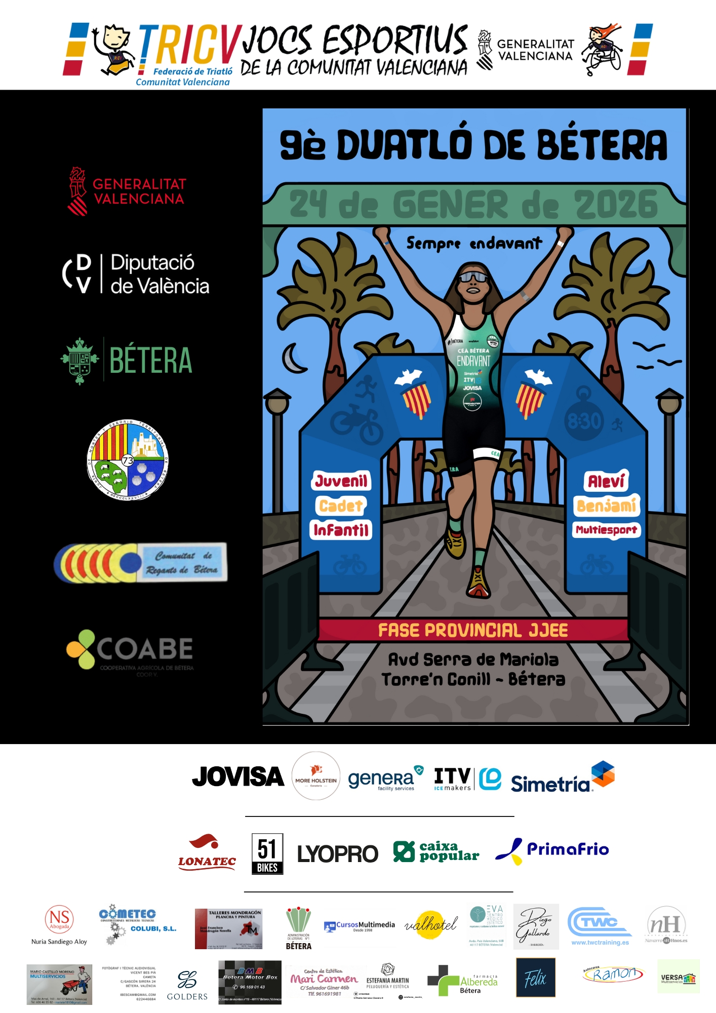 En 2019 realizamos la XV edición del Triatlón de Bétera y la III edición del Duatlón y participamos activamente en la Volta a la Comunitat Valenciana, la Cursa del Arbres i Castells i la Cursa de Nadal.
