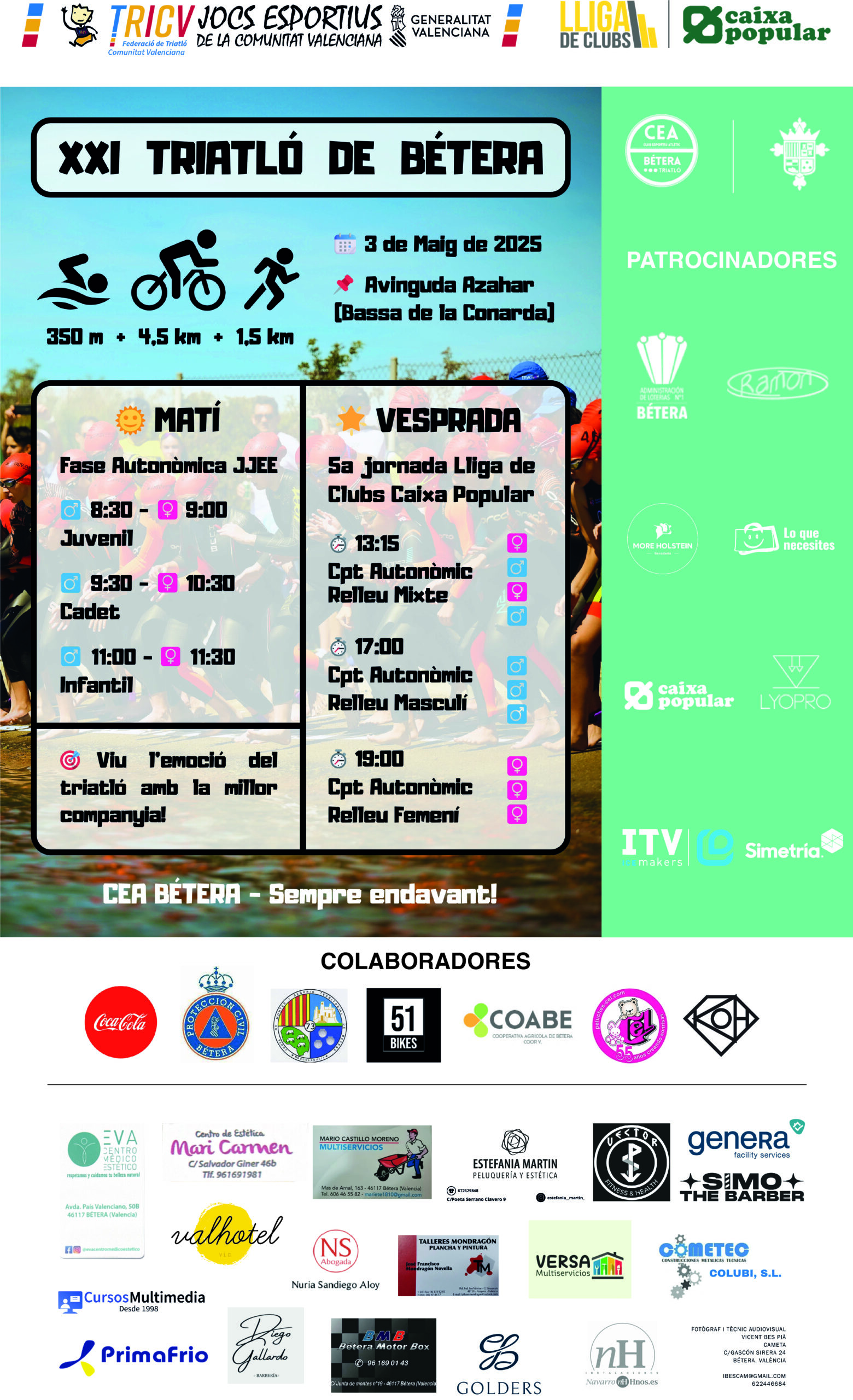 CEA Bétera quiere ser una entidad protagonista en la organización de eventos propios del triatlón en el municipio de Bétera y, también, en la colaboración de eventos importantes que necesiten de voluntariado, siempre vinculados al término.